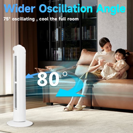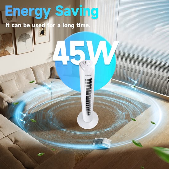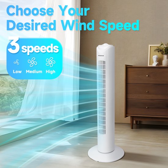 Deze torenventilator levert een stille maar krachtige luchtstroom. Op de laagste stand is het geluid nauwelijks hoorbaar en op de hoogste stand is het geluid slechts 55 dB, zodat u zich kunt concentreren op uw werk, kunt lezen of een dutje kunt doen met de ventilator aan.