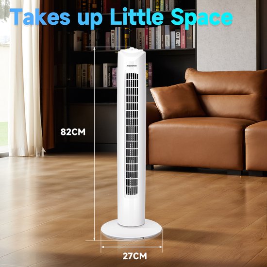 Je kunt de 33QRV Torenventilator instellen in drie verschillende snelheden en het kan 85 graden draaien op zijn onderstel zodat je een hele kamer kunt koelen. Door zijn slanke ontwerp neemt de torenventilator weinig ruimte in en past de ventilator eenvoudig in elke hoek van de slaapkamer of woonkamer.